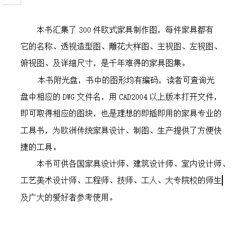 本书除了将对指导家具生产、科学技术和艺术文化历史研究提供可贵的参考资料外,还可供世界各国建筑设计师、家具设计师、室内设计师、工艺美术设计师、画家、雕塑家、大专院校师生和技术工人及业余爱好者参考。