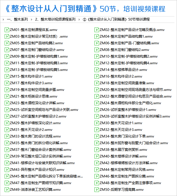 ①《整木设计从入门到精通》培训视频课程, 共计50节课,100小时, 容量大小:27 GB,格式:主流播放器