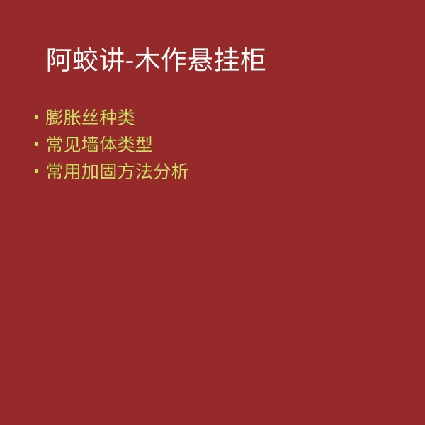 橱柜吊柜、敞开小柜、靠墙悬空大高柜、靠墙悬空大高柜、悬挂柜、长排抽屉电视柜、悬空长书桌、敞开层板、悬空浴室柜、岛台、膨胀丝种类、常见墙体类型、常用加固方法分析