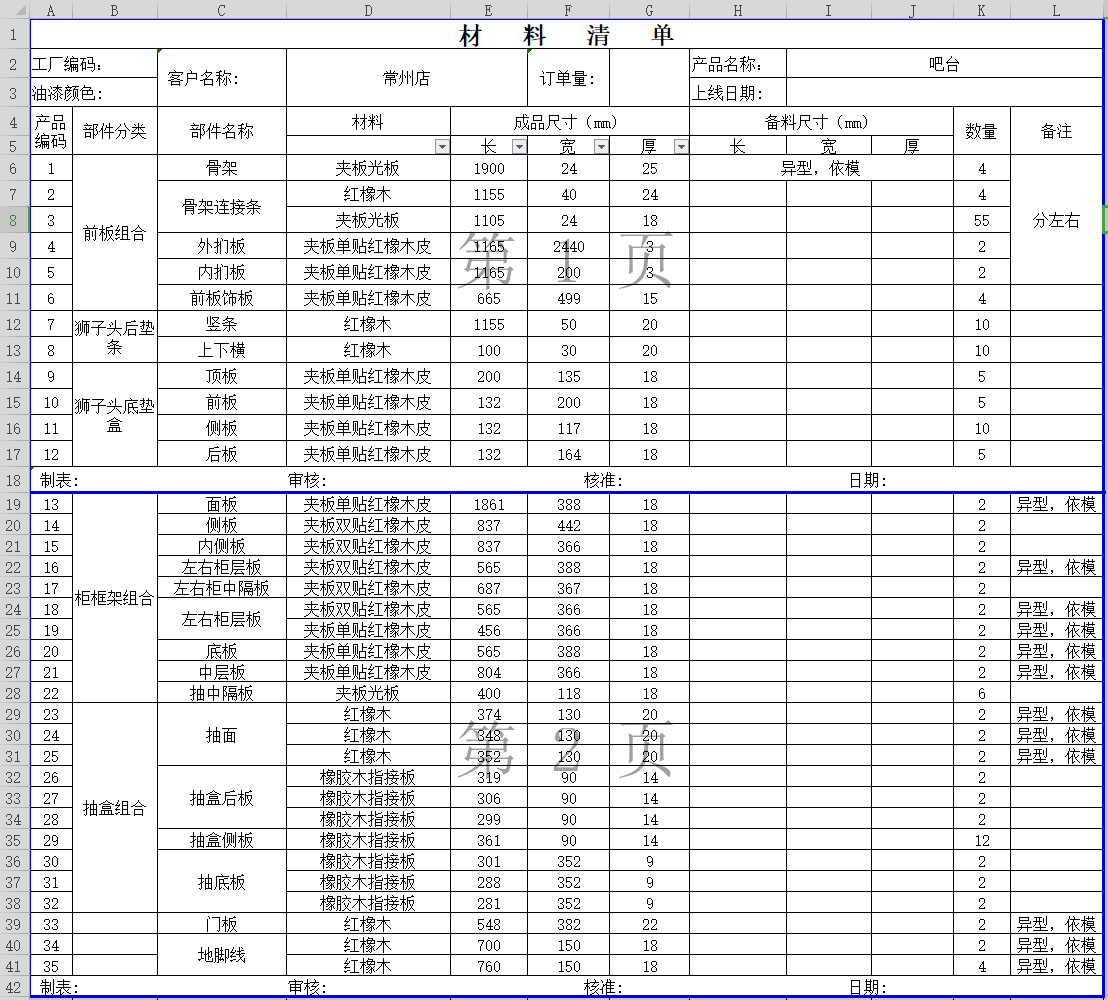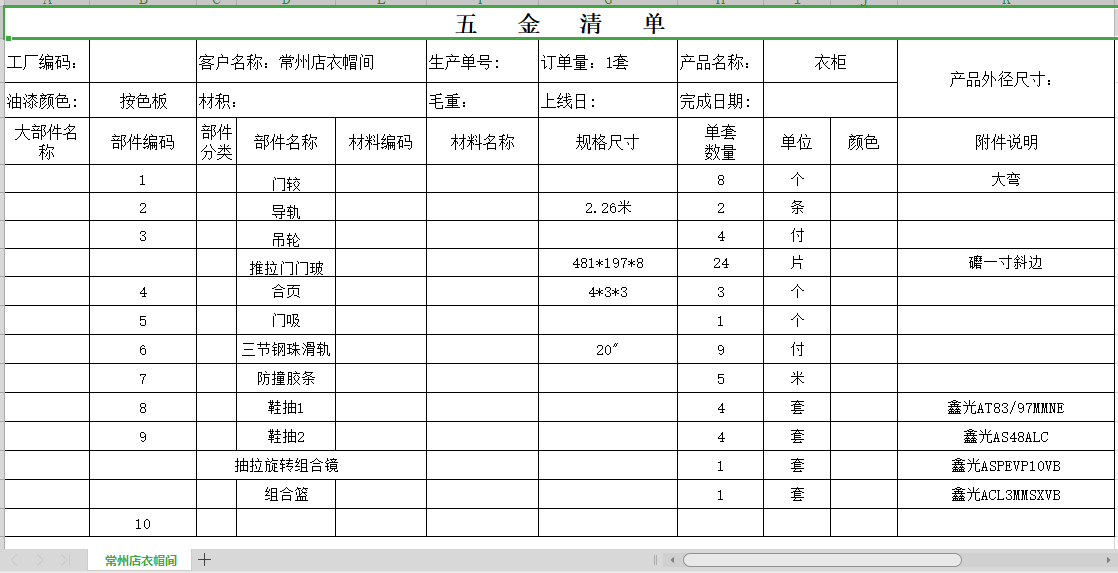 对了还有配套的五金清单表