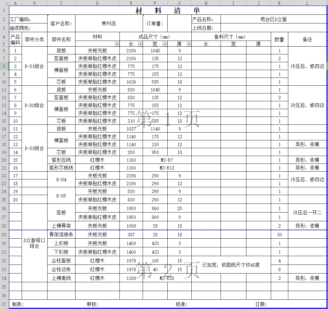 吧台区护墙料单