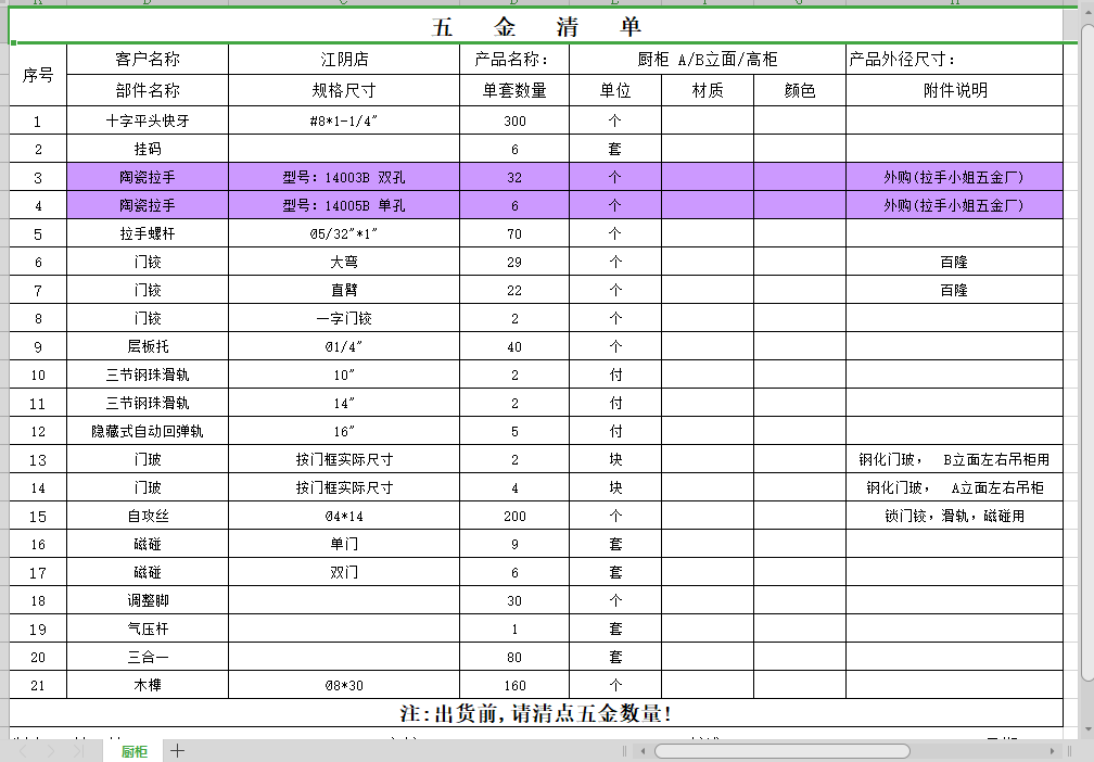 江阴店 厨柜五金表