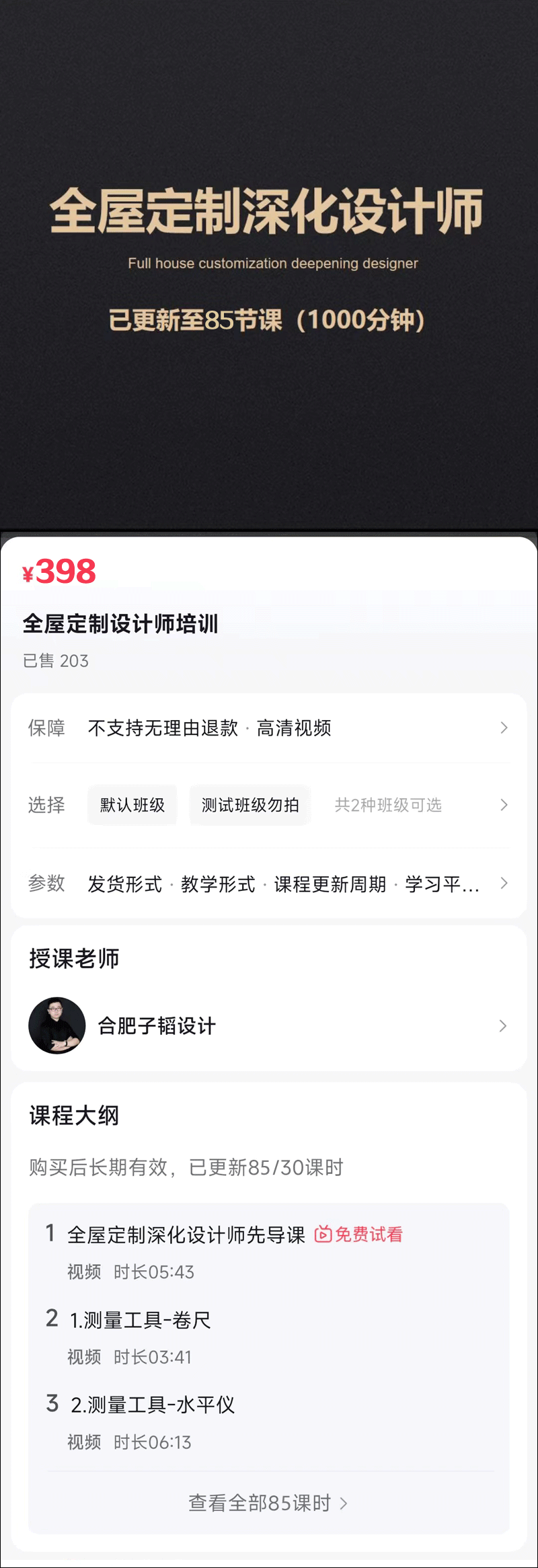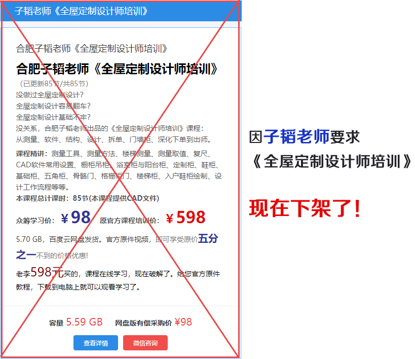因子韬老师要求,合肥子韬老师《全屋定制设计师培训》昨天下架了。