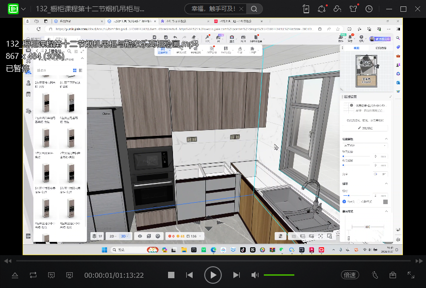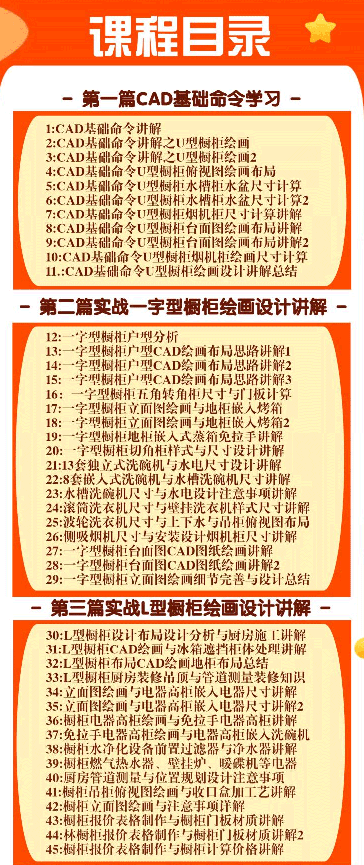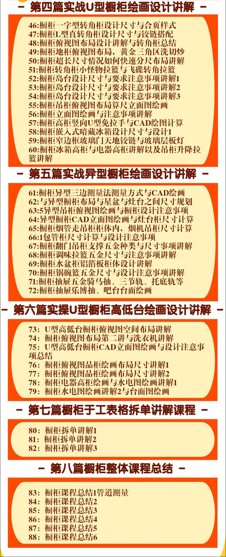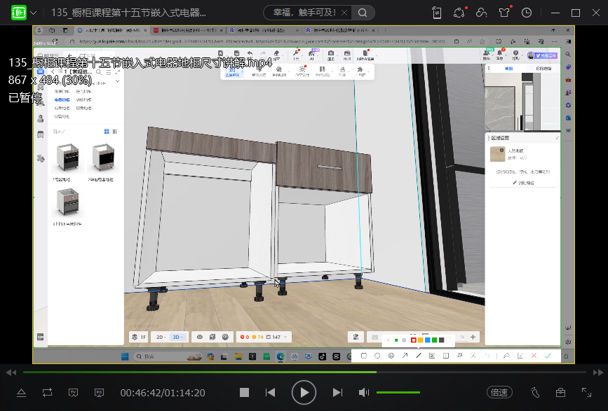 课程精讲:一字型橱柜、L型橱柜设计、橱柜吊柜、橱柜L型直转角柜、橱柜岛台、异型吊柜、橱柜拆单、地柜、高柜、实战U型橱柜等等。