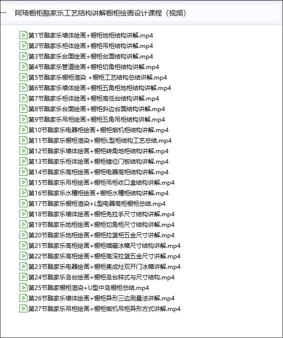 课程精讲:橱柜地柜、橱柜吊柜、橱柜台面、橱柜切角柜、橱柜五角柜地柜、橱柜高低台、橱柜五角吊柜、橱柜L型柜、橱柜错位门板、橱柜吊柜收口盒结构等等。