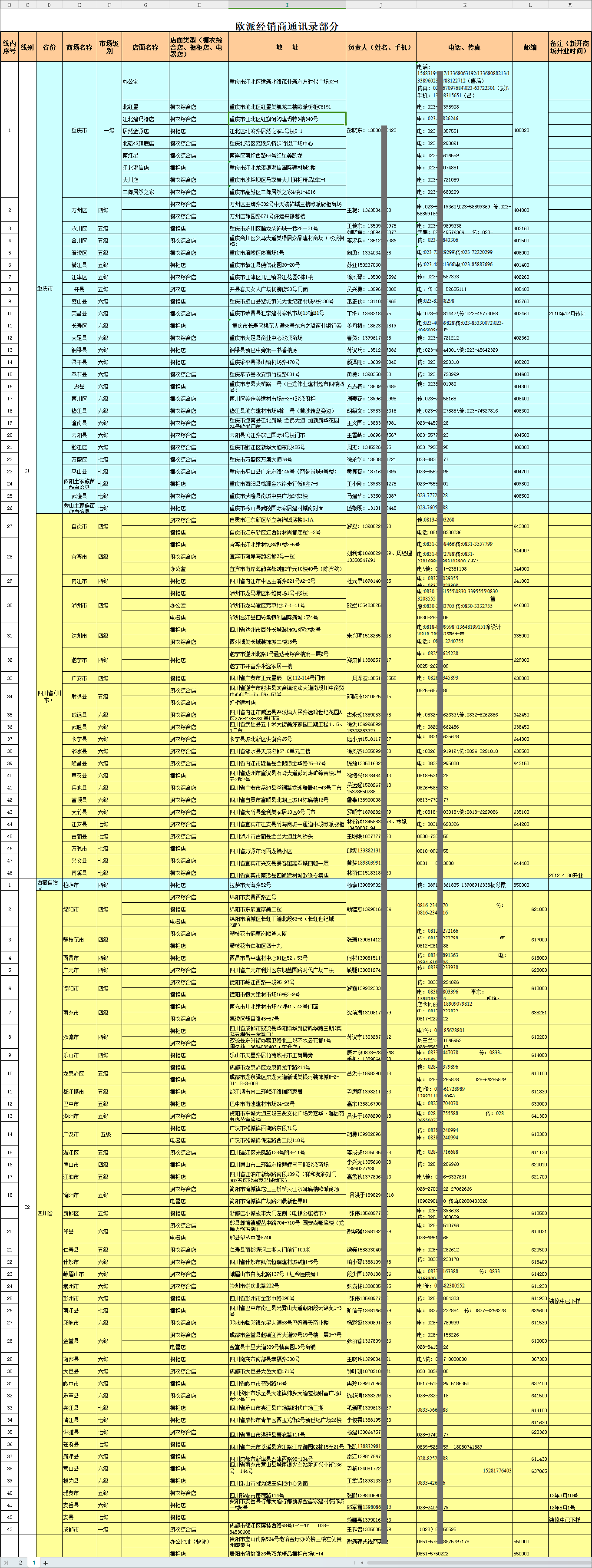 欧派经销商通讯录部分
