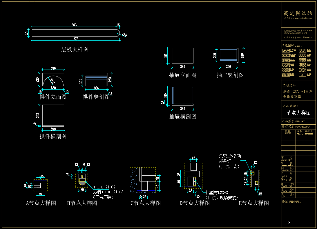 老李(X7)-T系列书柜标准图:节点大样图CAD图纸,文件格式:Dwg,AutoCAD2007软件以上版本可打开
