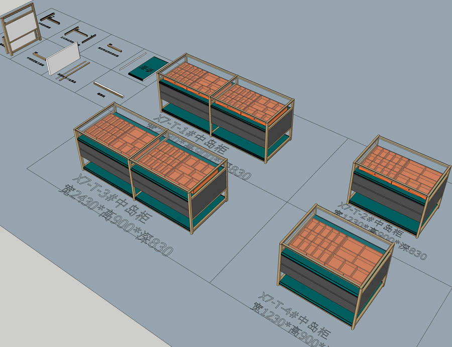 1、T系列标准中岛柜共分为4款,分别为X7-T-1#中岛柜、X7-T-2#中岛柜、X7-T-3#中岛柜、X7-T-4#中岛柜,尺寸分别为2430mm*900mm*830mm、1230mm*900mm*830mm、2430mm*900mm*930mm、1230mm*900mm*930mm;