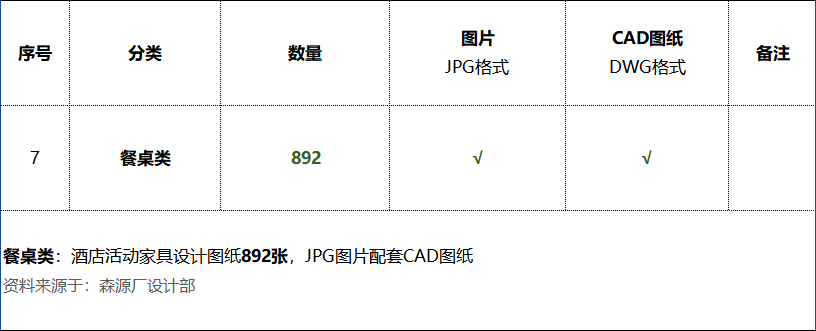 《餐桌类:酒店活动家具设计图纸892张》数量统计