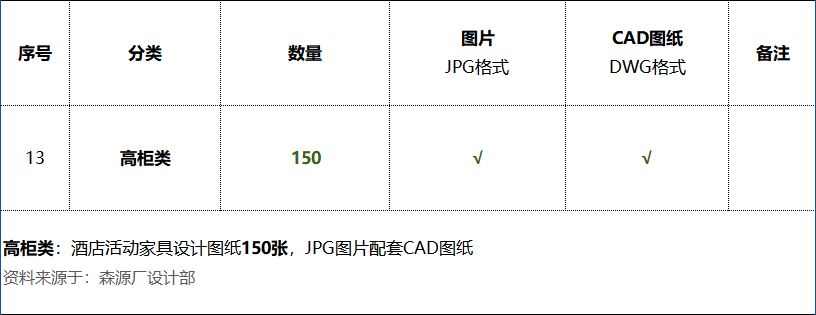 《高柜类:酒店活动家具设计图纸150张》数量统计