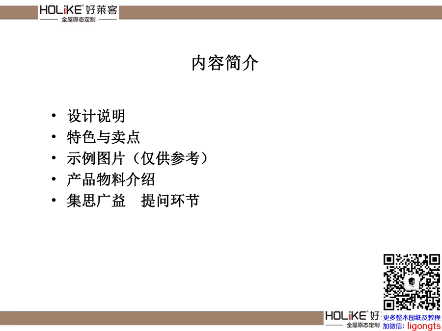 有偿分享价:5 元 请加老李微信:ligongts 付款后,索要资料。 (备注:整木培训资料)
