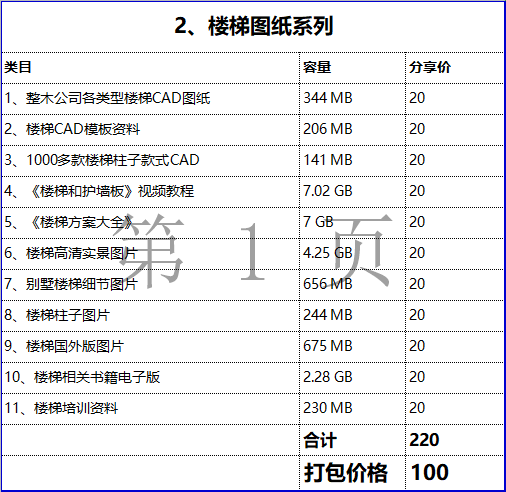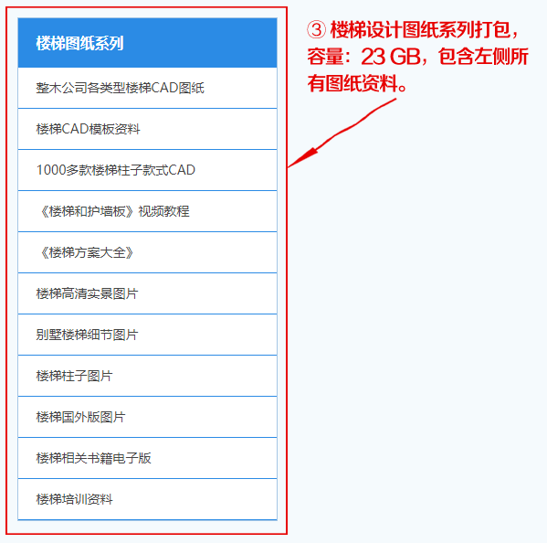 ③ 楼梯图纸系列打包(23GB)包含以下类目及容量:(点击蓝色文字可打开链接查看详细内容)