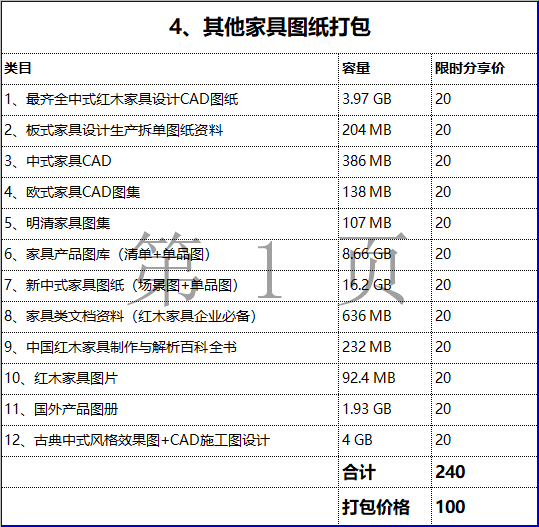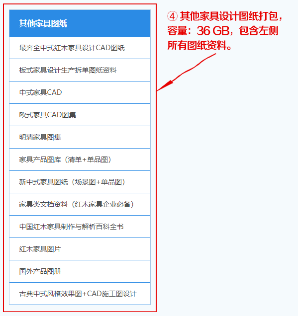 ④ 其他家具图纸打包(36 GB)以下类目及容量:(点击蓝色文字可打开链接查看详细内容)